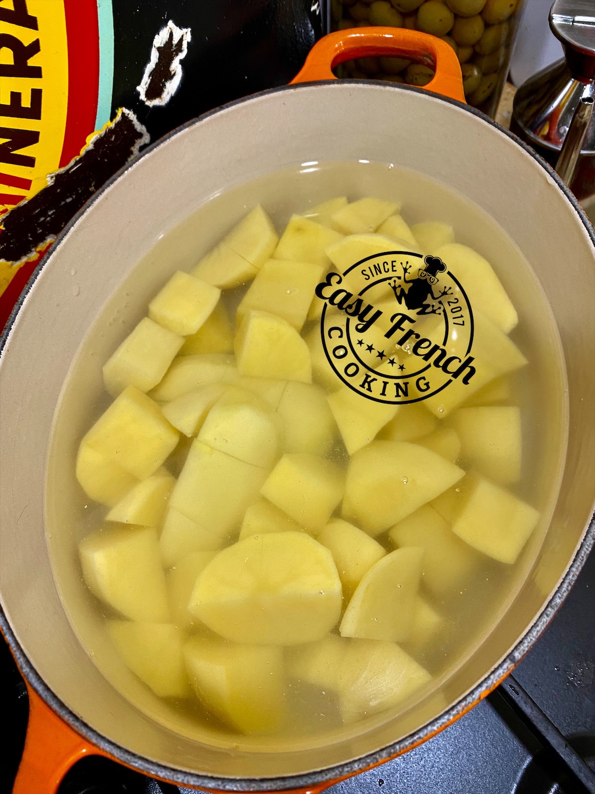 Peel and cut you potatoes in large chunks, place in a large sauce pan and cover with cold water.