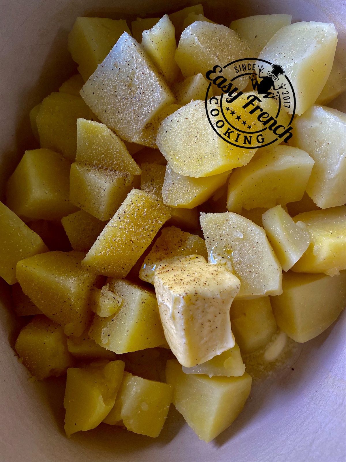 At this stage you could add a whole egg, or just and egg yolk to give colour, or some creme fraiche. Try and see what you prefer…. I only use butter, because it keeps a firm consistence and a fair amount of butter makes the purée very creamy.